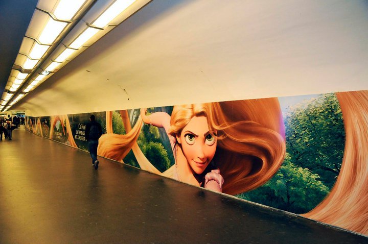Foi colocado um poster gigante num Metro em França com exactamente o mesmo comprimento dos cabelos de Rapunzel, ou seja, mais de 20 metros de comprimento.